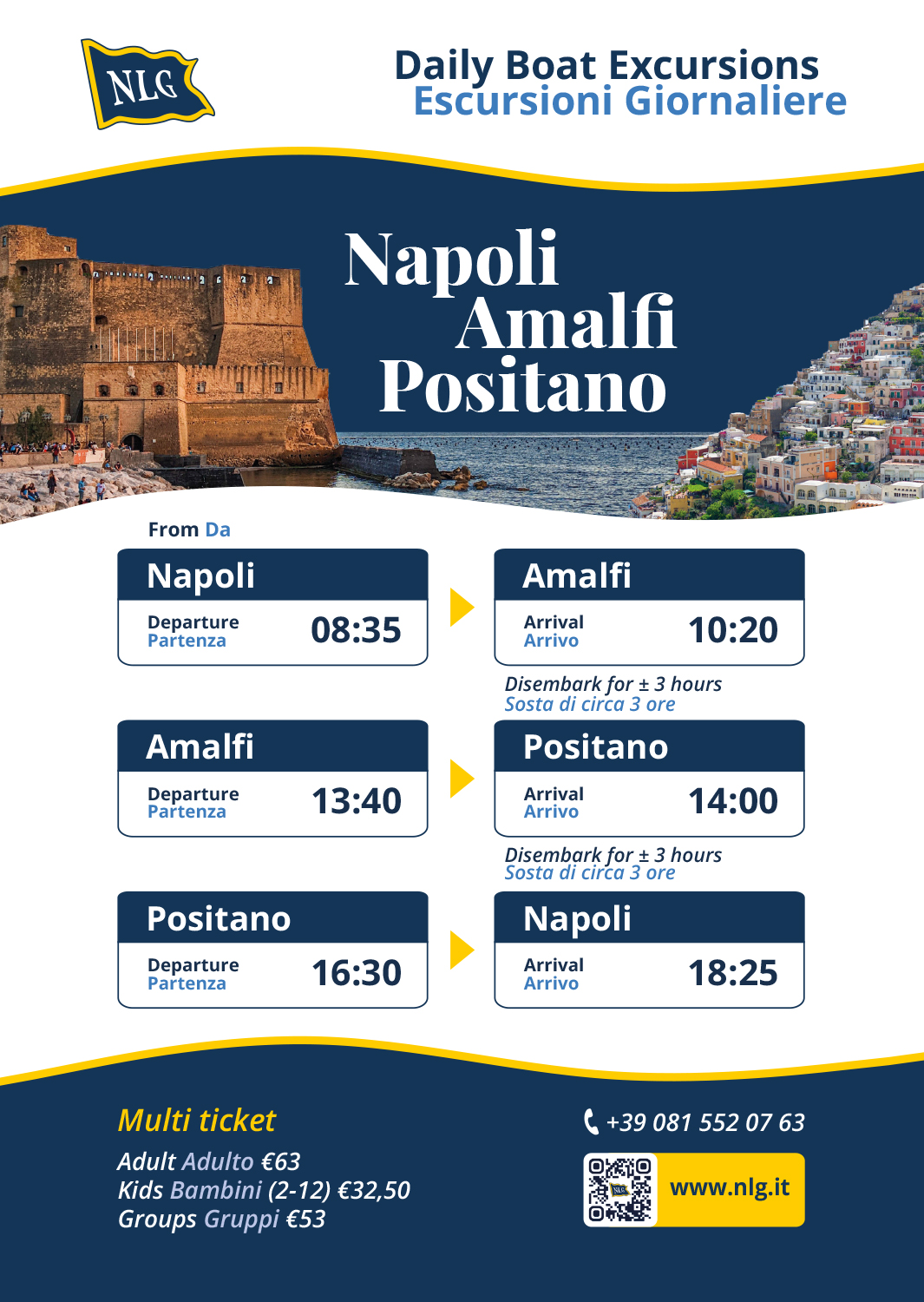 Programma: Partenza in mattinata da Sorrento arrivo ad Amalfi con sosta di circa 3 h e 50 min. Proseguimento per Positano con sosta di circa 1h e 45 min. Partenza da Positano e ritorno a Sorrento in serata.
